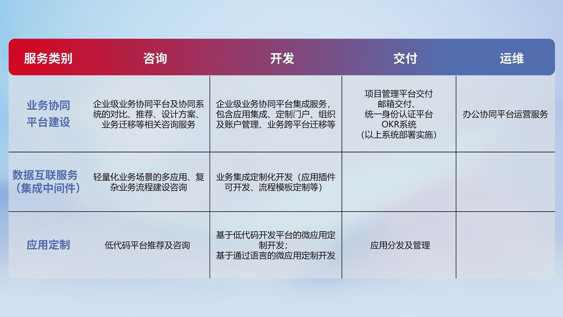 针对钉钉、、企微、、、、IDaas等平台级产品提供产品的规划、、方案、、交付、、定制化开发等服务,,,,实现如统一协同办公、、智能客户服务、、混合会议管理、、、智能数据查询、、、、等业务场景,,,,实现数字化转型。。。。